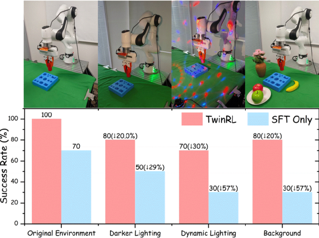 此外,即使在物体位置扰动与环境变化条件下,TwinRL 依然能够保持稳定表现,展现出更强的空间泛化与探索能力。