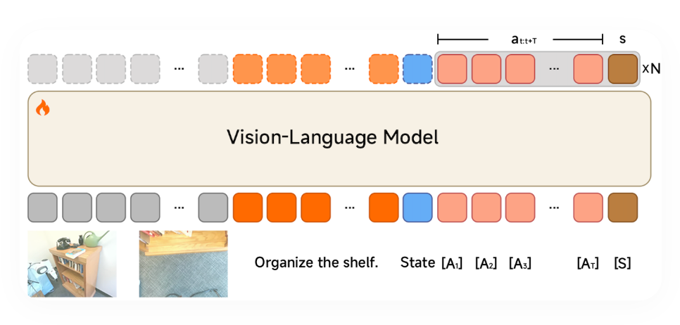 这种分工确保模型在引入动作能力后依然保持强大的视觉语言能力,那么机器人在执行任务时就既能读懂复杂指令,又能规划连续动作。