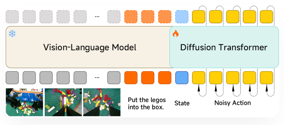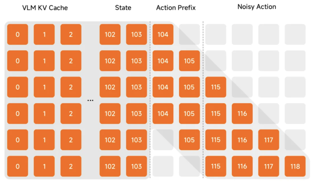 由于DiT与底层VLM同为Transformer结构,可以直接复用VLM的KV Cache,减少重复计算。