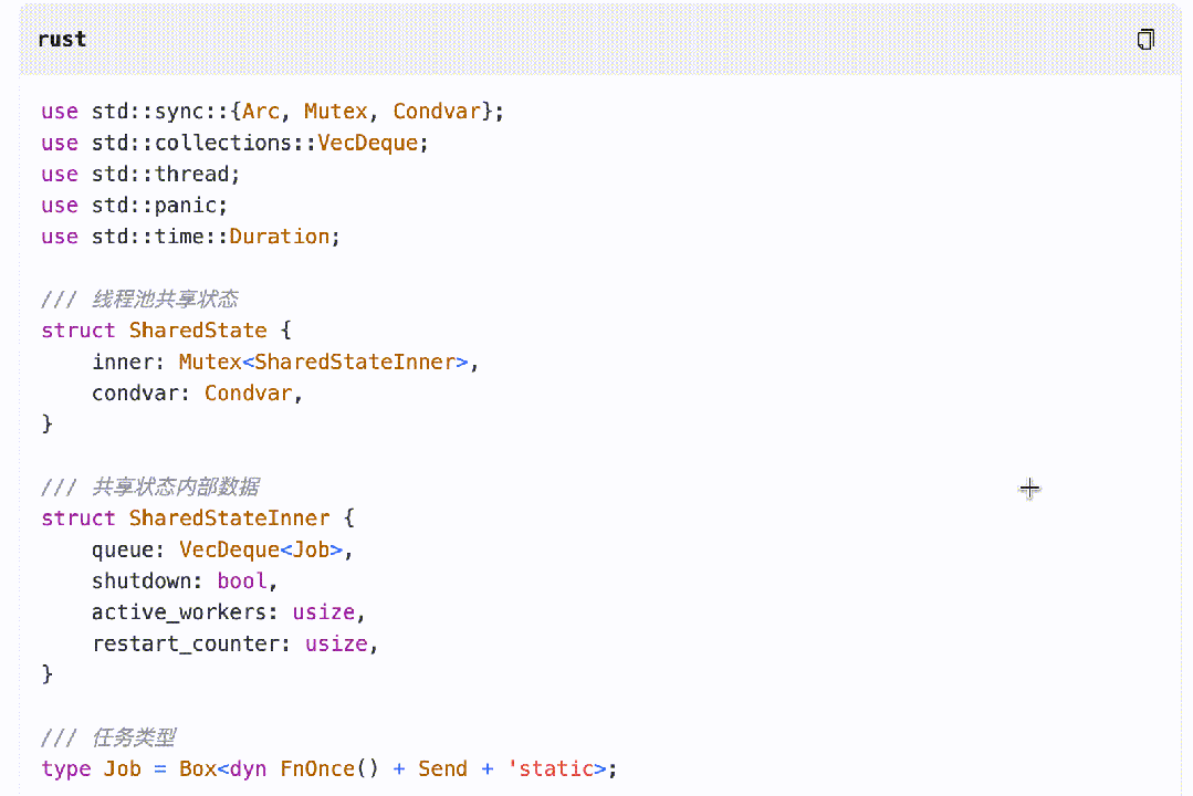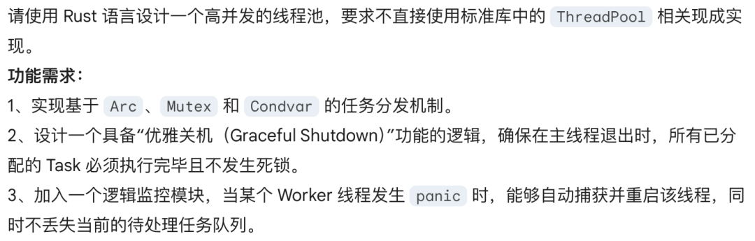这道代码实测题要求模型用Rust语言从零开始手写一个高并发线程池,模型得在不用任何现成库的情况下,靠Arc、Mutex和Condvar把任务分发逻辑给硬生生地搭出来。