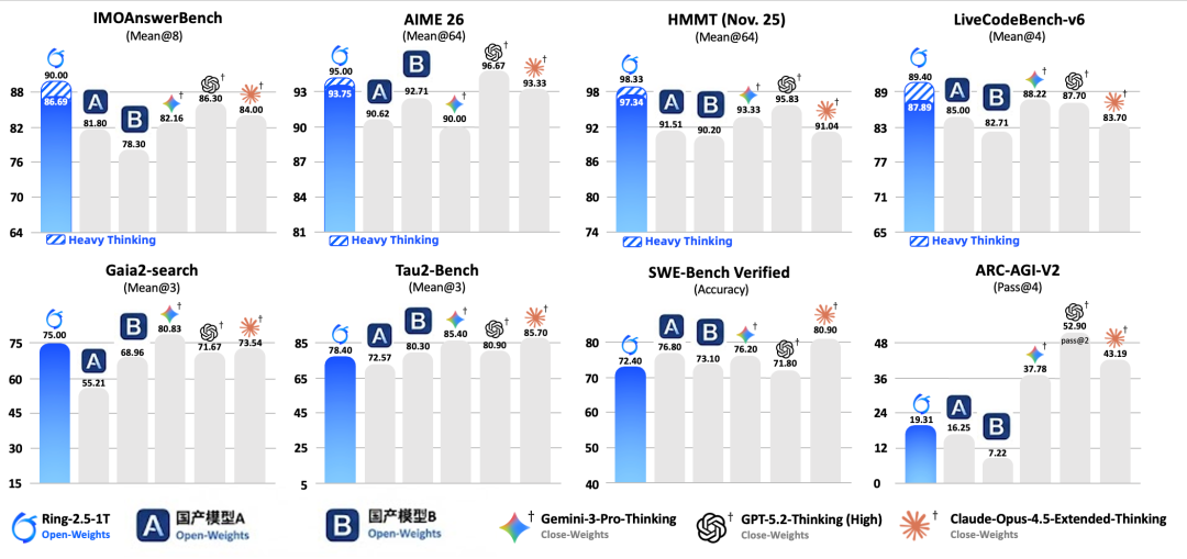 改造后,Ring-2.5-1T的激活参数量从51B提升至63B,但其推理效率相比Ling 2.0仍实现了大幅提升。