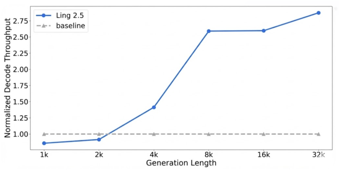 但Ring-2.5-1T靠架构创新,成功实现在生成长度拉到32K以上时,让访存规模直接降到了1/10以下,同时生成吞吐量暴涨了3倍多。