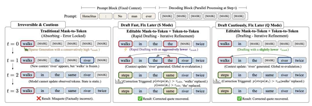 这种架构不仅大幅提升了吞吐效率,也让模型具备了独特的Token编辑与逆向推理能力。它可以直接在推理过程中对文本中间的特定Token进行精准修正,或者基于预设的边界条件进行反向逻辑追溯。