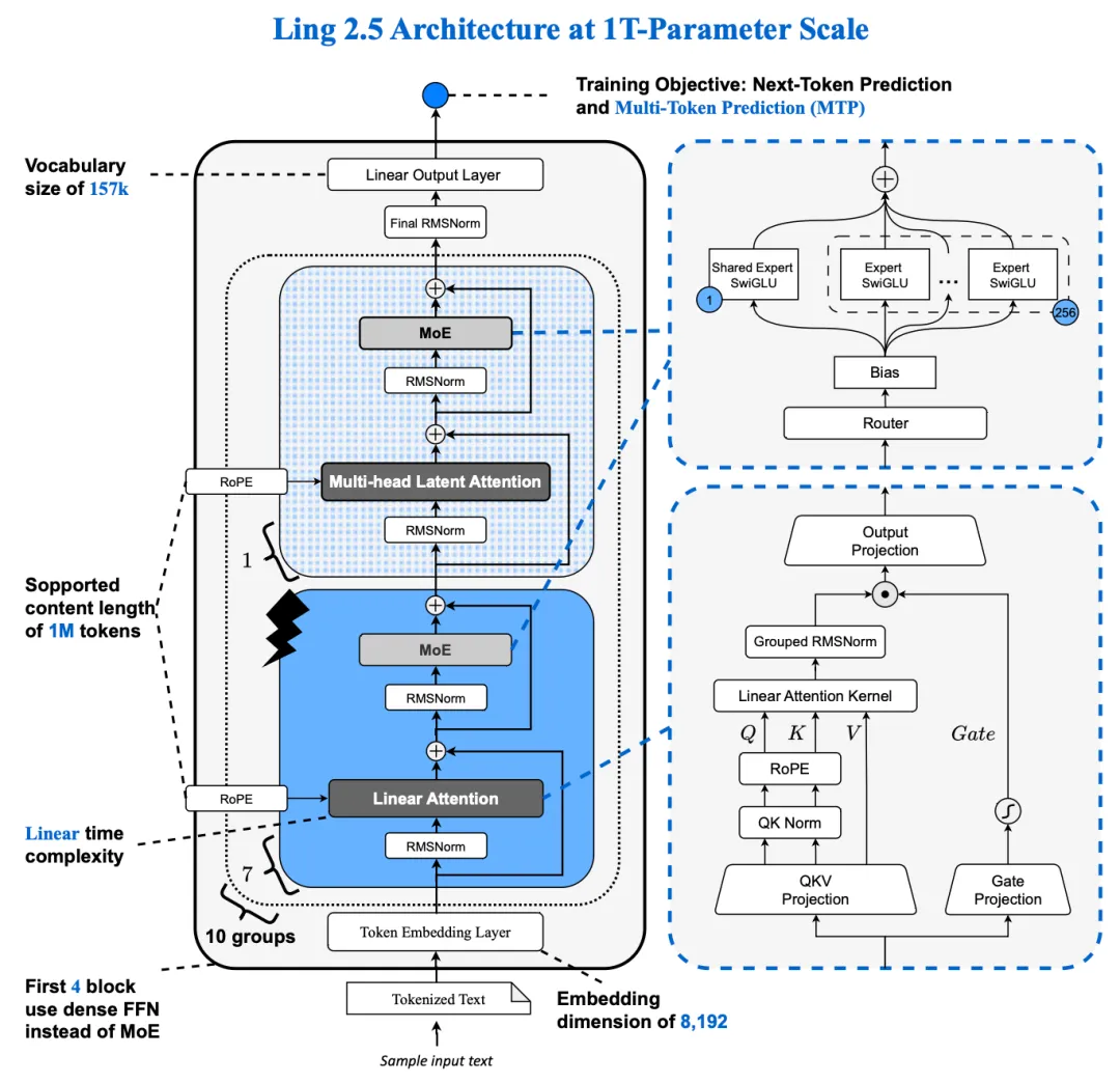 这种架构基于Ring-flash-linear-2.0技术路线演进而来。具体来说,其采用了1:7的MLA(Multi-Head Latent Attention)配Lightning Linear Attention的混搭设计。