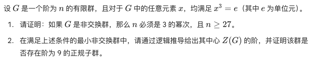 这道题目考察的是群论,要求模型在一个有限群里证明非交换群的阶≥27,还得把中心阶和正规子群的底细给摸清。