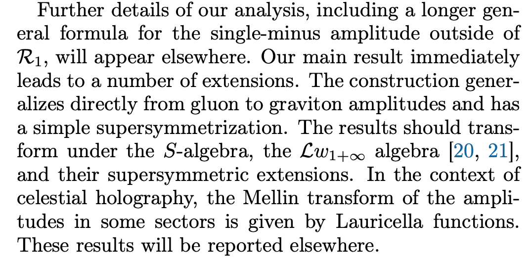 论文提到,单负振幅的构造可以直接从胶子推广到引力子振幅,有一个简单的超对称化方案;在天穹对偶理论框架(Celestial Holography)下,某些扇区中振幅的Mellin变换由Lauricella函数给出;结论应当在一些超对称推广下具有变换性质……