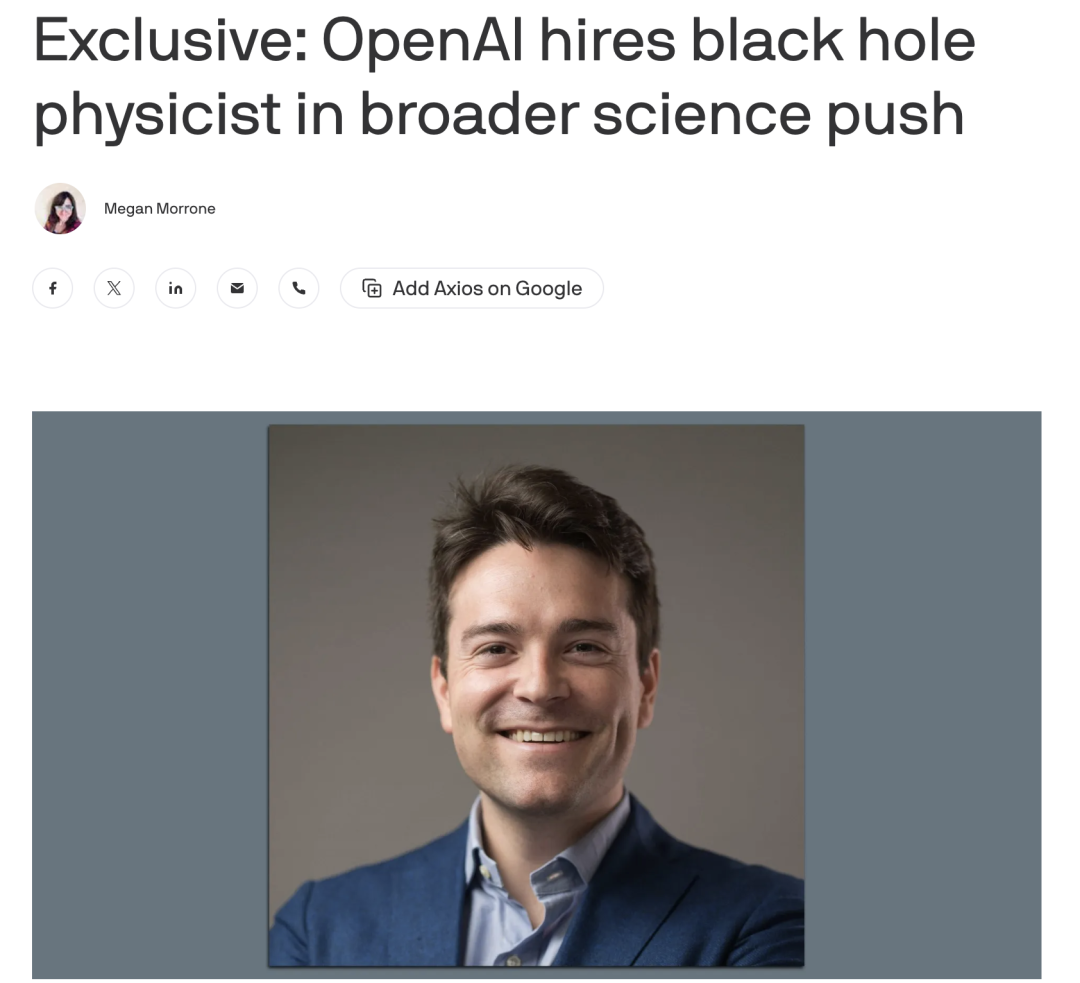 这事当时也有消息传出:2025年10月,OpenAI聘请黑洞物理学家Alex Lupsasca推动科学研究新计划。