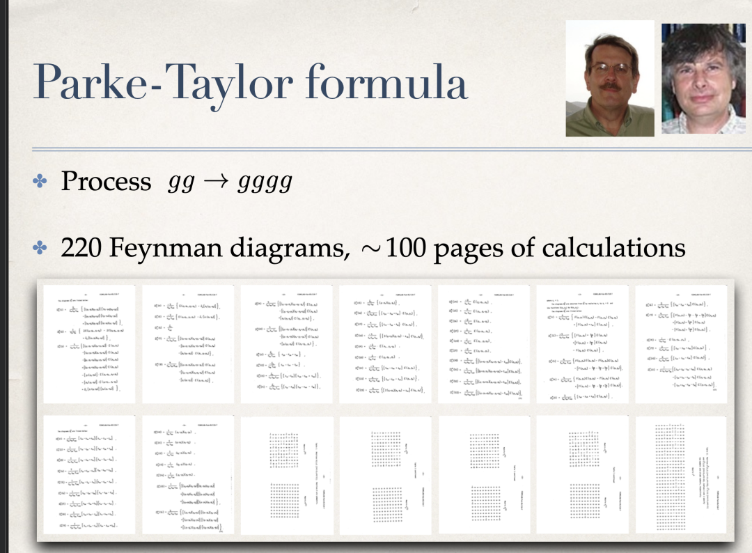 标准模型中费曼图展开的理论计算与实验吻合到了小数点后14位,但计算本身极其困难,n个胶子的散射振幅所需的费曼图数量随n以超指数速度增长。