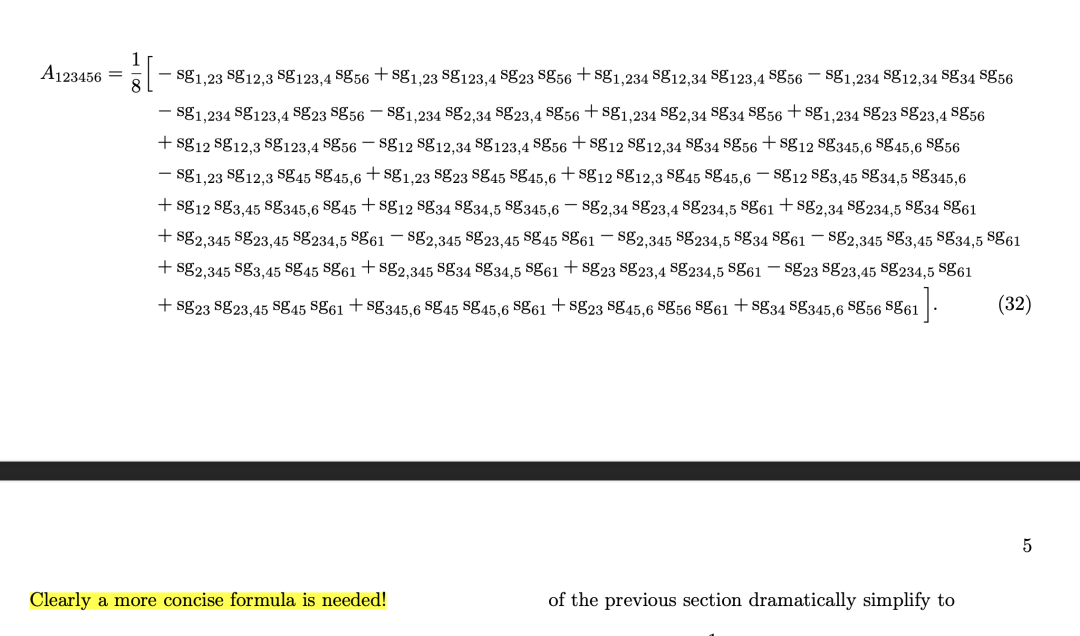 3个粒子时只有1项,4个粒子时2项,5个粒子时8项。到6个粒子时,论文中写出的一般表达式已经有32项,全部是各类符号函数的乘积组合。