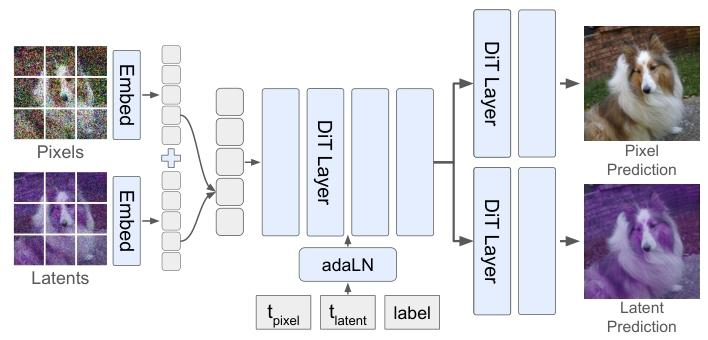 在训练和生成过程中,模型会同时处理像素和潜变量。不同的是,团队为两者定制了独立的降噪节奏: