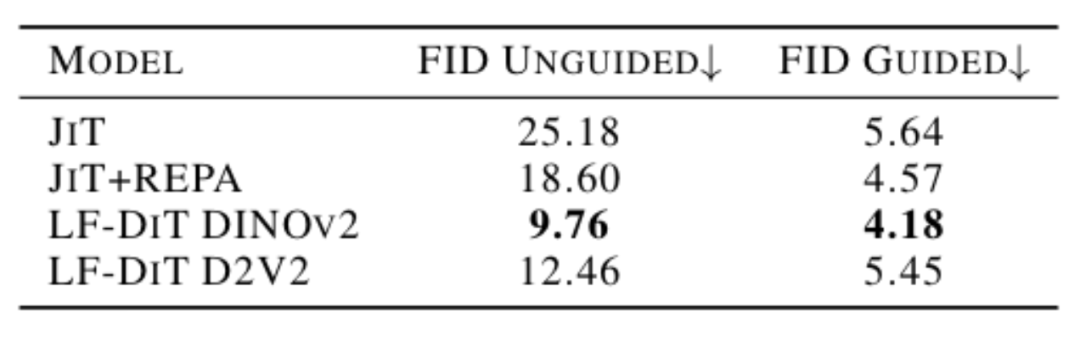 在200个epoch的最终模型(ViT‑L 规模)下,Latent Forcing实现了条件生成FID 2.48(guided)、无条件生成FID 7.2(unguided)的分数。