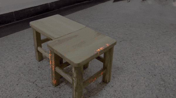 当火焰在木凳上燃起时,观察者不仅能看到火光本身,还能看到火光在地面上投下的摇曳倒影,以及周围物体因被照亮而产生的明暗变化。
