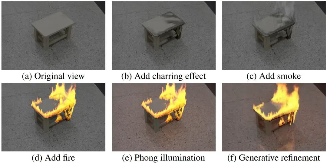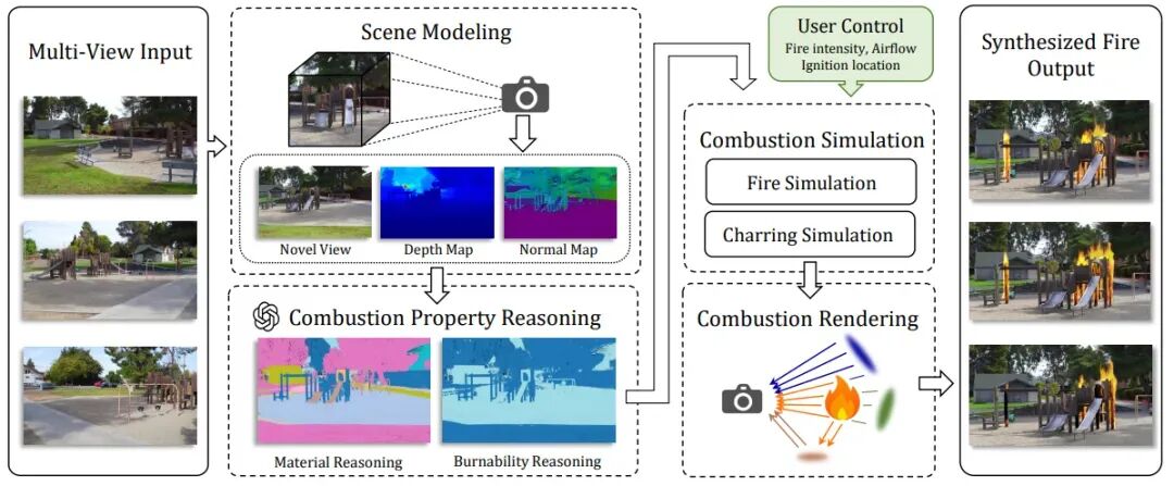 这项工作并非视觉层面的简单合成,而是另辟蹊径,构建了一套将多模态大模型(MLLM)的语义理解能力、燃烧动力学物理仿真与 3D 高斯溅射(3DGS)渲染技术深度耦合的框架,首次在真实世界的 3D 重建场景中,实现了物理可信、语义感知且高度可控的燃烧合成。