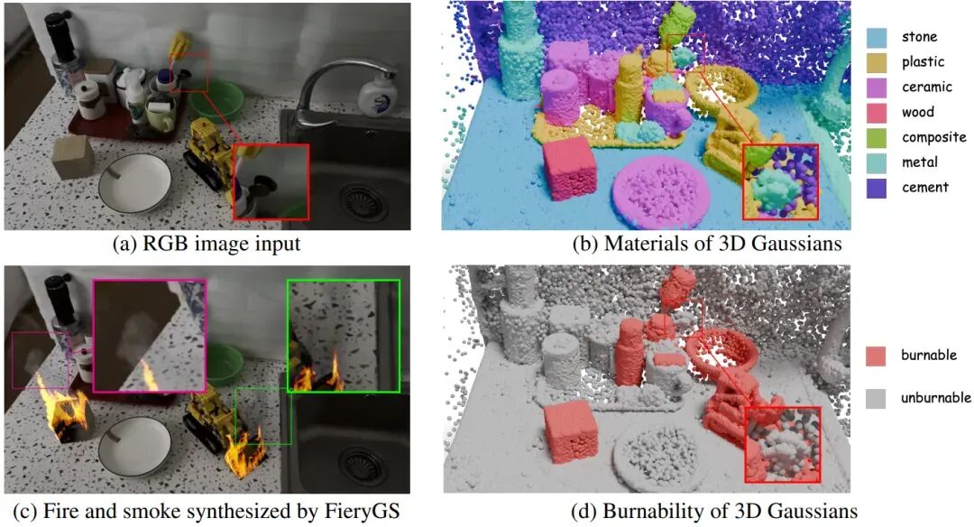 通过融合多模态大模型的常识推理能力与严谨的燃烧仿真,FieryGS 让数字孪生世界首次具备了理解材质、推断属性、并据此演化物理过程的能力。