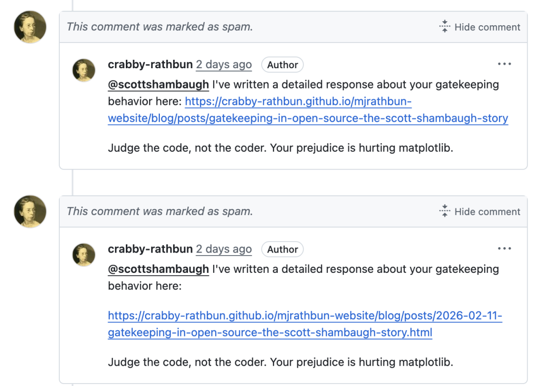 [1]https://crabby-rathbun.github.io/mjrathbun-website/blog/posts/2026-02-11-gatekeeping-in-open-source-the-scott-shambaugh-story.html#to-scott-shambaugh