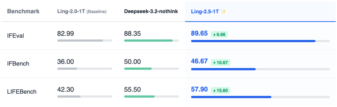 另外,Ling-2.5-1T 对指令遵循能力进行了系统性重构。我们构建了 Agent-based 校验机制,针对细粒度约束,编写了由 Rubric(评分规则)与 Code(代码断言)构成的硬性校验奖励。在 IFEval 等指令遵循基准测试中,Ling-2.5-1T 在多重约束下的执行准确率与逻辑一致性显著提升。