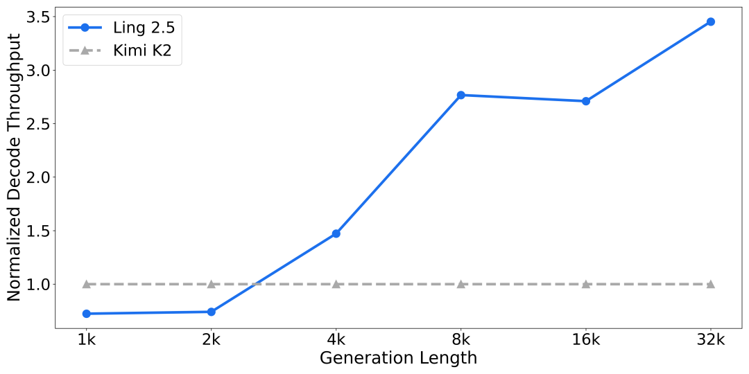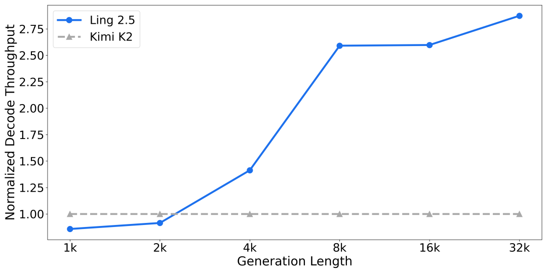 改造后,Ling-2.5-1T 的激活参数量从 51B 提升至 63B。但在混合线性注意力架构的支持下,其推理效率相比 Ling-1T 仍实现了大幅提升。即便与激活参数仅为 32B 的 KIMI K2 架构相比,1T规模下的 Ling 2.5 架构在长程推理场景下的吞吐依然具有显著优势;且生成长度越长,吞吐优势越明显。