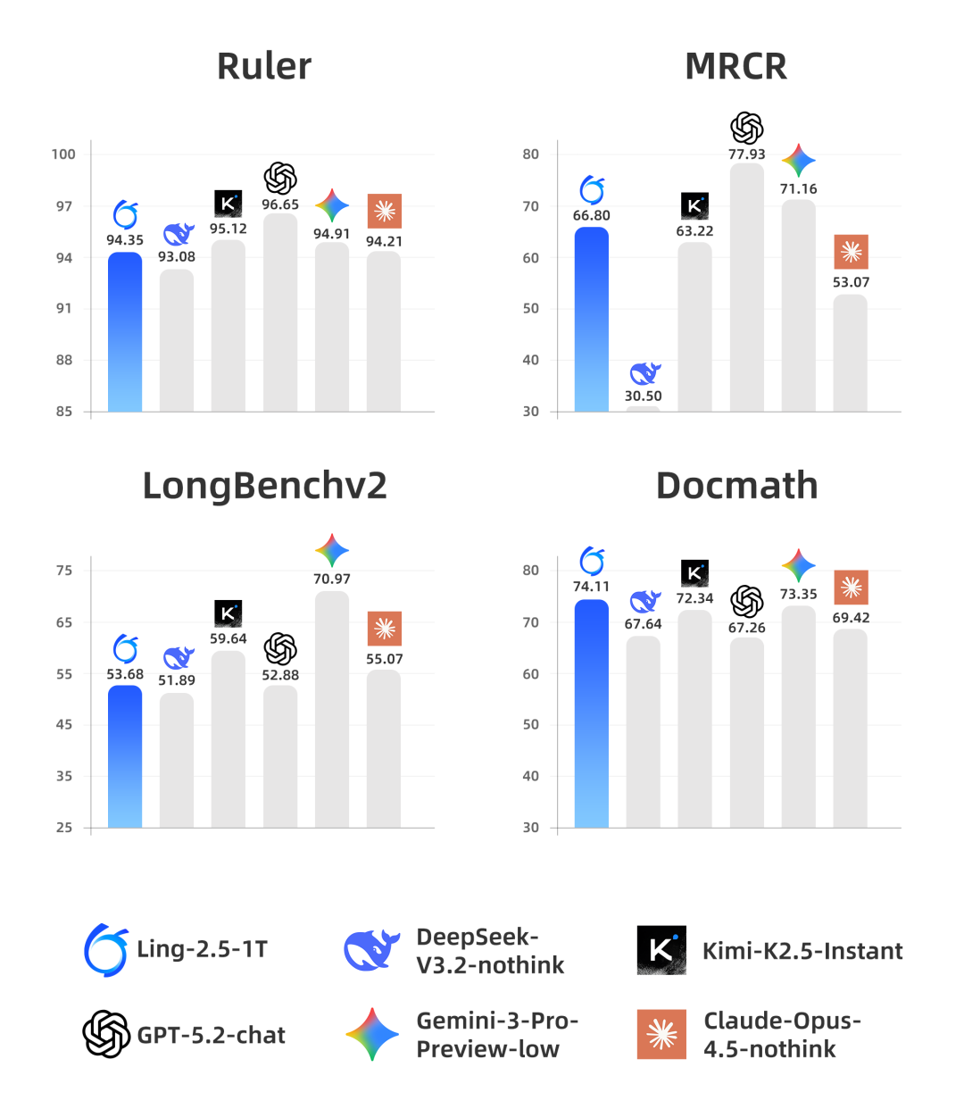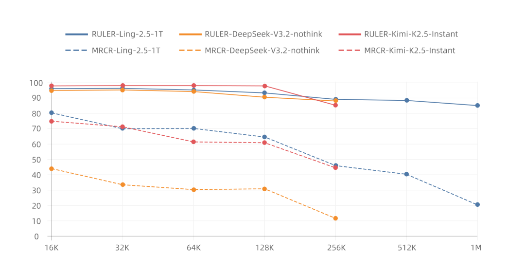 此前,社区对混合线性注意力在超长上下文推理的有效性仍存在一定争议。针对这一问题,我们对 Ling-2.5-1T 开展了系统性的超长上下文基准评测。结果显示,Ling-2.5-1T 在对比采用 MLA 和 DSA 架构的大型即时模型(如 Kimi K2.5、DeepSeek V3.2)时,在多项超长上下文任务中展现出效果优势;同时也可以看到,与领先的闭源 API 模型(如 GPT-5.2、Gemini 3 Pro)相比,仍存在一定差距,后续版本将持续推进相关能力的进一步提升。