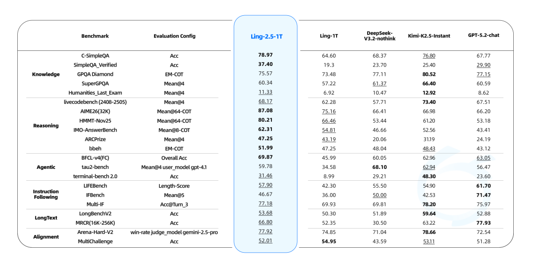 我们全面评估了 Ling-2.5-1T 在知识、推理、智能体交互、指令遵循、长文本处理等多个权威基准评测上的表现。Ling-2.5-1T 与前代模型 Ling-1T 对比,实现了全方位的能力提升,是百灵家族当前最强大的即时模型。在与主流的大尺寸即时模型(DeepSeek V3.2、Kimi K2.5、GPT 5.2)对比中,Ling-2.5-1T 在复杂推理、 指令遵循能力具有明显优势。
