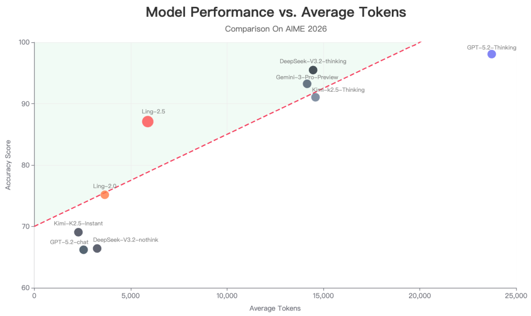 Ling-2.5-1T 延续了演进式思维链(Evolutionary CoT)的后训练方法,并将强化学习奖励升级为兼顾“正确性”与“过程冗余”的复合指标。在 AIME 2026 这一最新高难数学基准上,它在平均输出约 5890 token 的情况下显著超越前代,逼近平均消耗 15k–23K token 的前沿思考模型。通过“由浅入深”的激活策略,长链条推理被高效折叠为直觉式响应,进一步拓展了即时模型效率与效果的平衡边界。