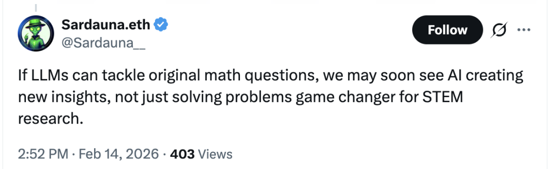 如果大语言模型能够处理原创性的数学问题,那么我们或许很快就会看到AI不只是解题,而是开始产生新的洞见——这将成为STEM研究领域的一个颠覆性转折点。