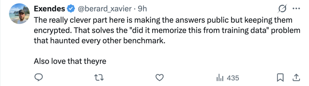 这里最聪明的地方,是把答案公开,但用加密的方式保存。这基本解决了困扰其他benchmark的老问题,模型是不是从训练数据里记住了答案。