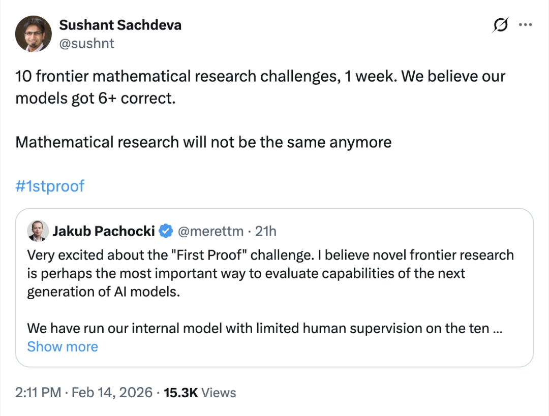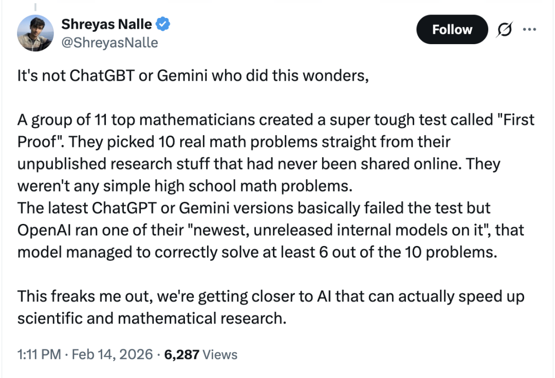 由11位数学家构建的高难度问题集,直接取自未发表研究;它们无法通过检索获得答案,只能依赖推理与构造。在这样的设定下,即便公开版本模型表现有限,内部模型仍能正确解决10题中的至少 6 题,这件事真正引发讨论的点,也就不在“成绩”,而在能力形态。