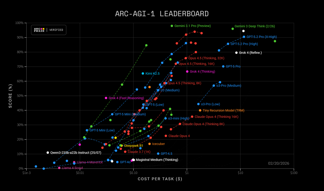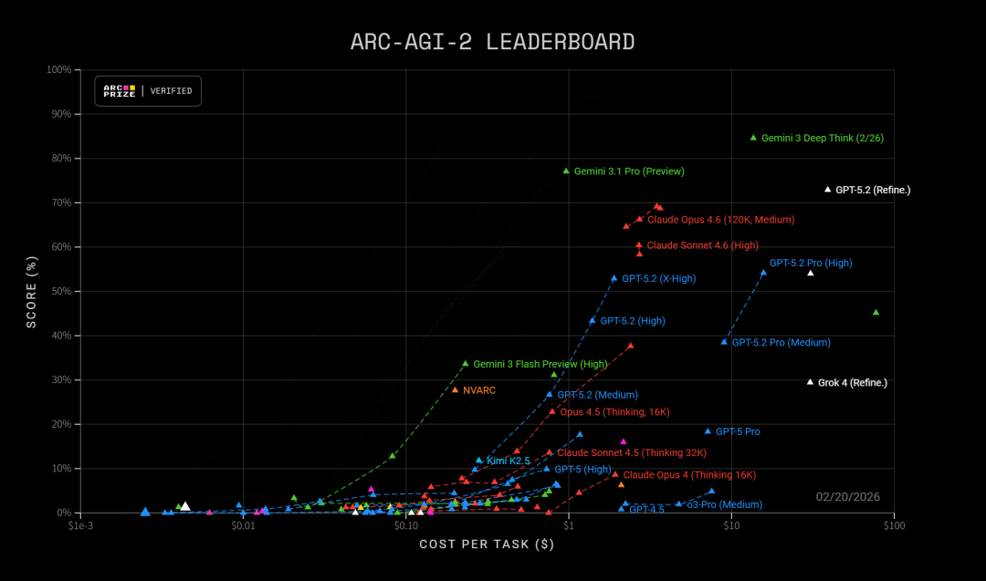 外加接近满分(98%)的ARC-AGI-1,不管是思考拉满的Claude Opus 4.6,还是特调版的GPT-5.2,通通都被踩在了脚下。