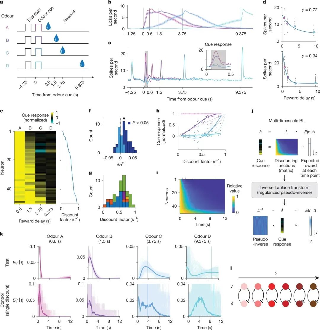 图8:多巴胺能神经元表现出多种折扣因子,使解码奖励延迟成为可能。a. 有提示延迟任务图示。b. 奖励发放前的预期舔舐行为。c. 四种试验类型的平均脉冲时序直方图。d. 两个单个神经元的示例提示反应拟合。e. 神经元群体的标准化提示反应。对于每个神经元,其反应被标准化为四种可能延迟中的最高反应。插图显示了每个神经元的推断折扣因子。f. 数据更符合指数模型而非双曲线模型。g. 神经元中推断折扣因子的分布(自助法的平均折扣因子)。h,归一化群体反应的形状与奖励延迟的关系。粗线表示平滑拟合,虚线表示理论值,点表示单个神经元。i,折扣矩阵。神经元的排序如图 d 所示。j,解码过程概述。k,未来奖励的主观预期时间可以从预测奖励延迟的提示的群体反应中解码出来。基于测试数据的提示平均反应的解码(上行;见方法)优于使用具有单一折扣因子的模型(群体平均折扣因子;下行;细线(浅阴影)表示单个自助样本的预测,粗线(浅阴影内的深阴影)表示自助样本的平均预测,单个深垂直线表示奖励时间;见方法;扩展数据图 4e)。l,每个多巴胺能神经元的 RPE 对一个独特的价值函数做出贡献的模型(见方法;扩展数据图 7f-k)。