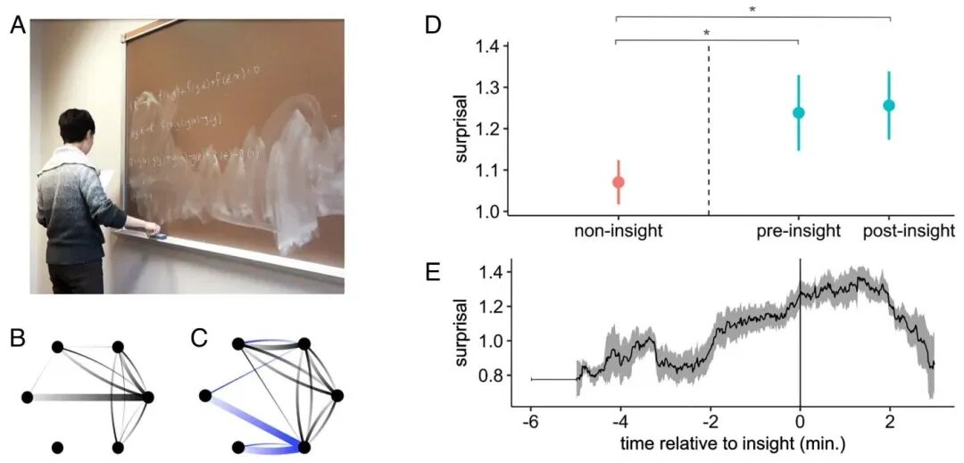 发表在 PNAS 上的一项研究让 6 位数学博士在自己熟悉的环境里沉浸式解普特南数学竞赛题,并对他们的实时行为进行密集记录,如书写、手势动作,共记录 4653 个离散动作事件。研究团队发现,在顿悟出现前,数学家与黑板的互动会变得越来越难以预测 —— 这与物理系统、生态系统发生转变前的临界波动(critical fluctuations)现象高度相似。他们还引入信息论里的 “意外度”作为临界转变的预警信号,并证明其适用于各类具有离散符号动态特征的系统。