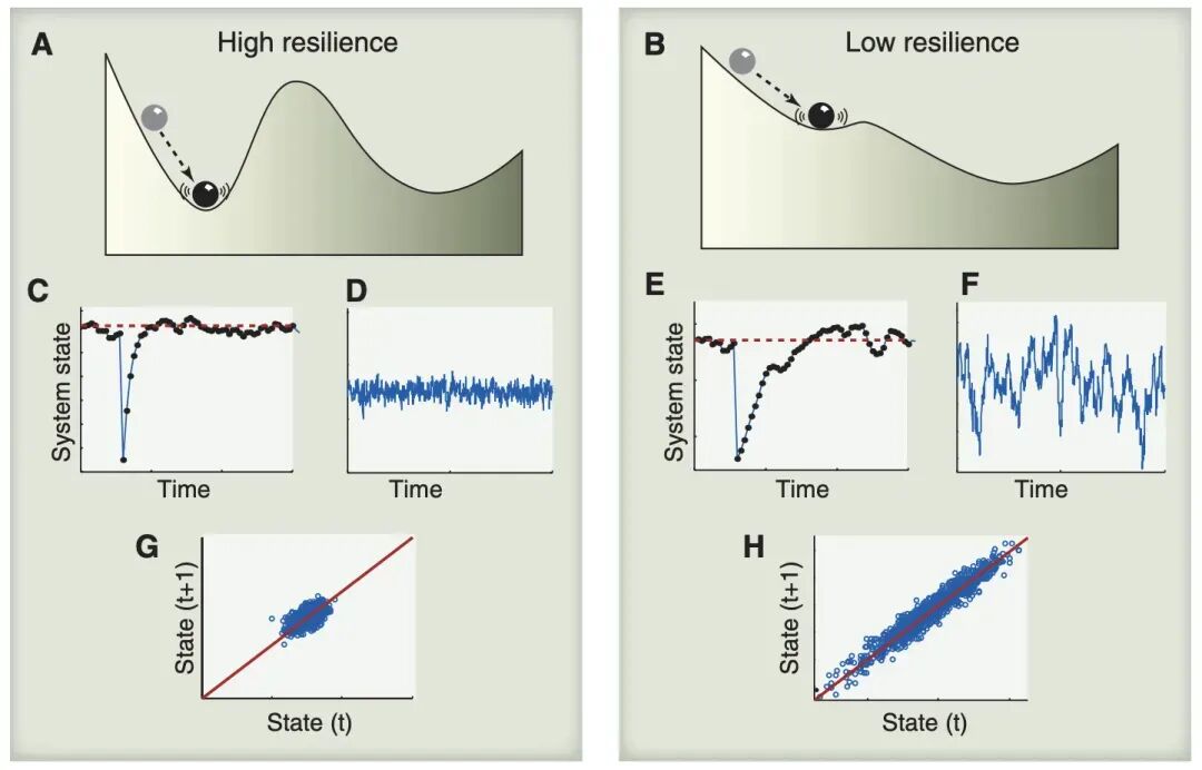 图 3: 临界减速:系统失去韧性并可能更容易转向其他状态的指标。当吸引域较小时(B),小扰动后的恢复速率(C和E)比吸引域较大时(A)更慢。这种减速效应可以通过系统状态中随机诱导的扰动(D和F)来测量,表现为方差的增加以及滞后-1自相关性(t和t+1时刻状态的相关性)反映的“记忆”增强(G和H)。