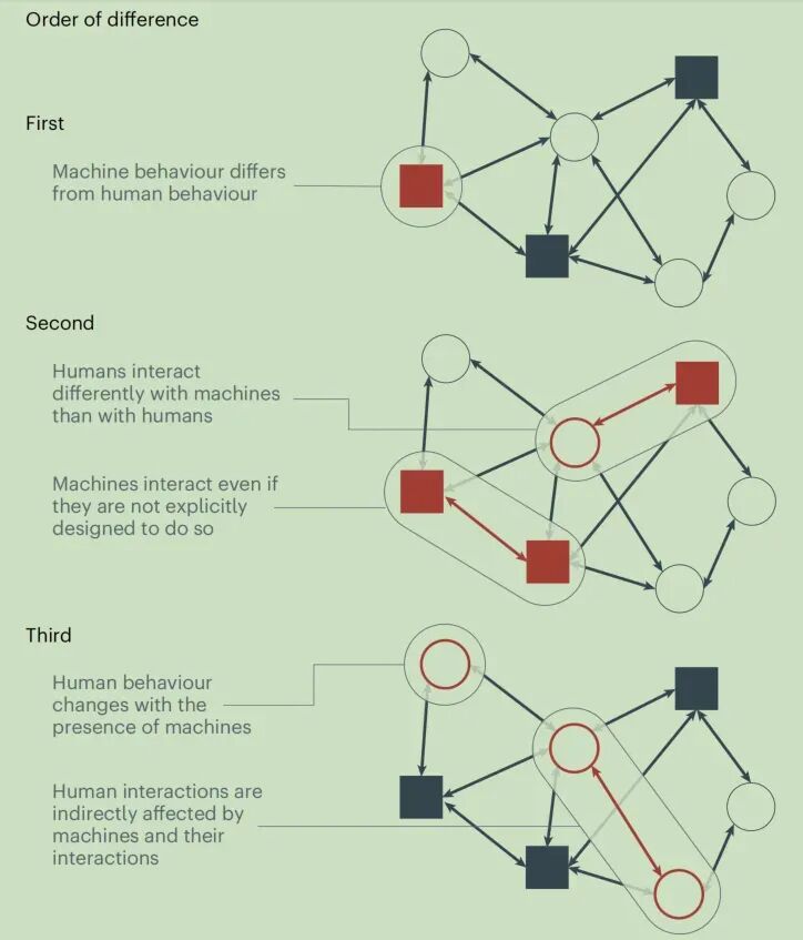 为了应对这一挑战,一篇发表于Nature Human Behavior的论文提出了一个全新的研究范式——“人机社会学” (A new sociology of humans and machines)。该研究主张,我们必须将人类与机器视为一个统一的、相互依存的复杂社会系统,并系统地考察人类之间 (H-H)、人机之间 (H-M) 和机器之间 (M-M) 的互动 。只有这样,我们才能理解这个新兴混合社会的运作规律,并引导其走向一个更稳定、高效和公平的未来。