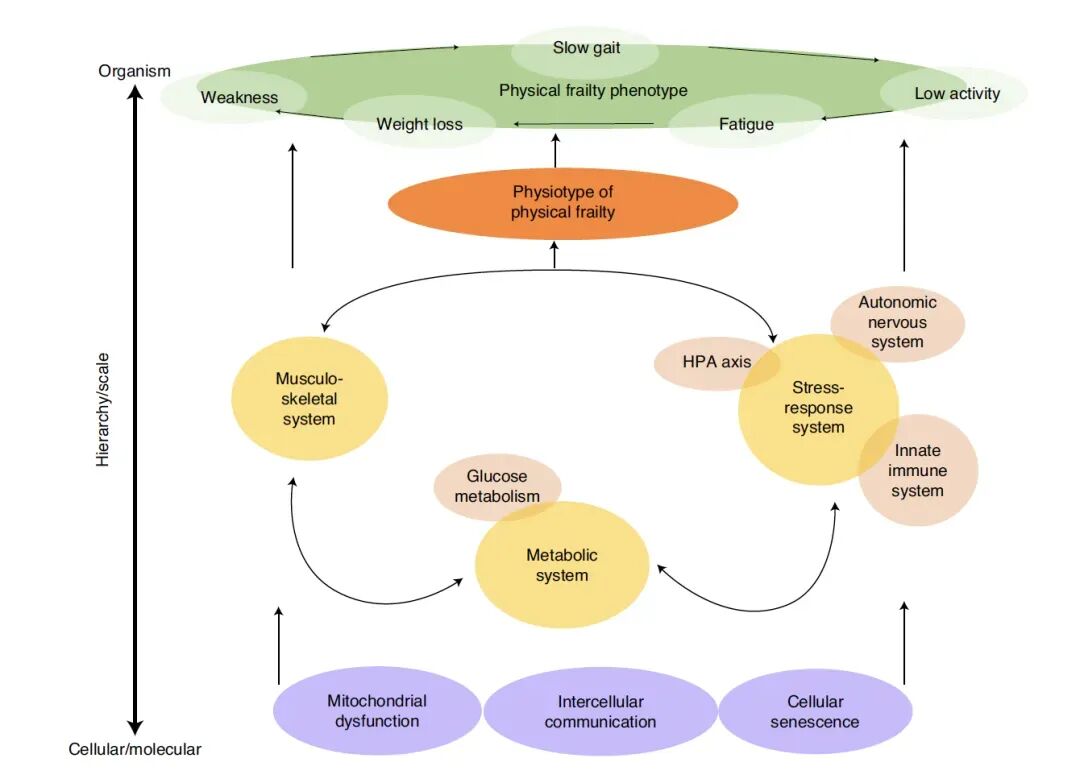 核心图:本示意图构建了生理失调与身体虚弱的多尺度层级关系:顶层的临床虚弱综合征是微观机制涌现的宏观表现,其下由三大核心生理模块(金圈)支撑,每个模块包含若干子系统(橙椭圆);最底层的细胞分子尺度应激源(紫椭圆)驱动上层生理模块失调,这些跨尺度组件通过相互作用形成聚合性失调生理类型(深橙椭圆),最终关联顶层的虚弱表型及相关脆弱性。