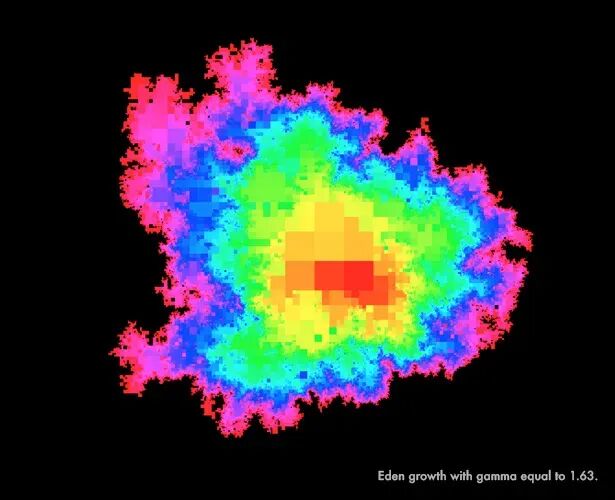 图2:二维随机曲线上的Eden生长,色彩表示时间。