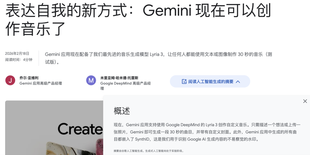 官方公告强调 Lyria 3 的设计目标是「原创表达,而非模仿现有艺术家」。