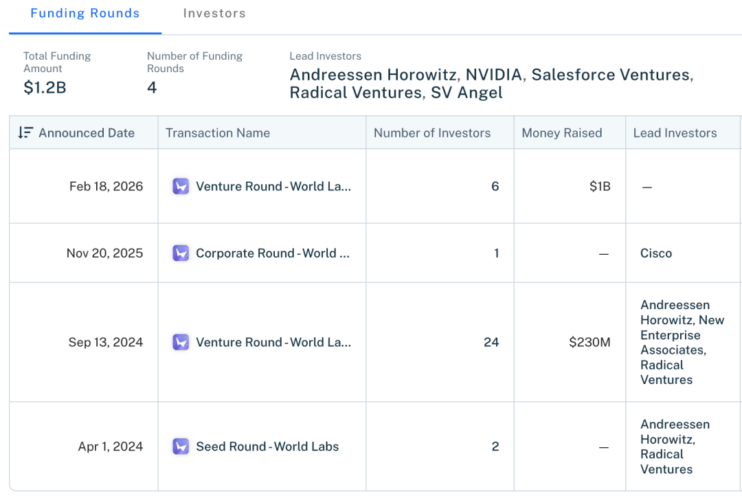 据Crunchbase统计,自成立以来,World Labs已完成4轮融资。