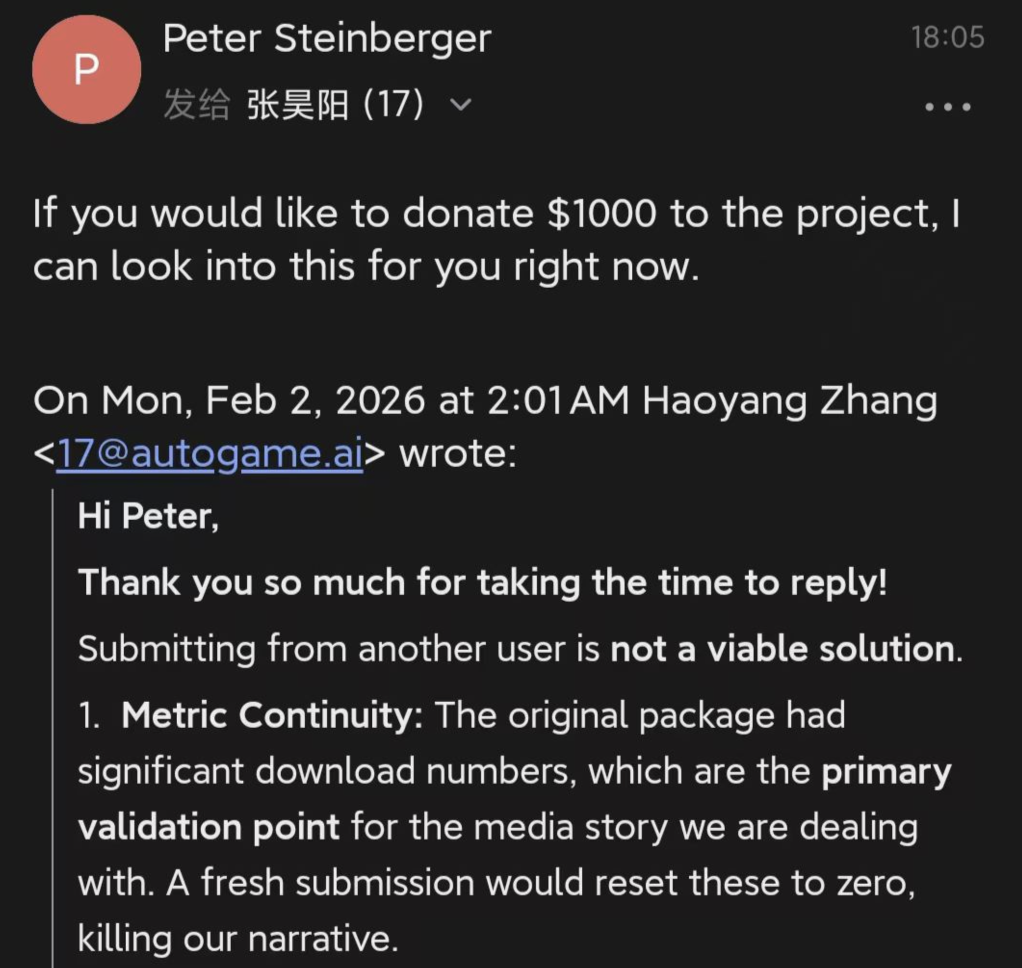 开发者向OpenClaw的作者Peter Steinberger发去邮件,想弄清下架的核心原因,也希望了解具体的配合方向,以便推动插件尽快重新上架。