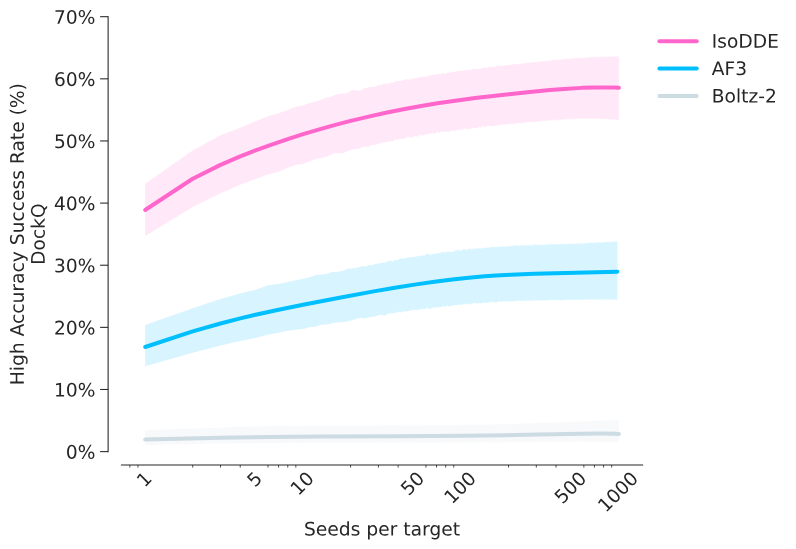 在预测抗体如何识别靶标这件事上,IsoDDE 的高精度预测成功率是 AlphaFold 3 的 2.3 倍,是另一个主流开源模型 Boltz-2 的近 20 倍。