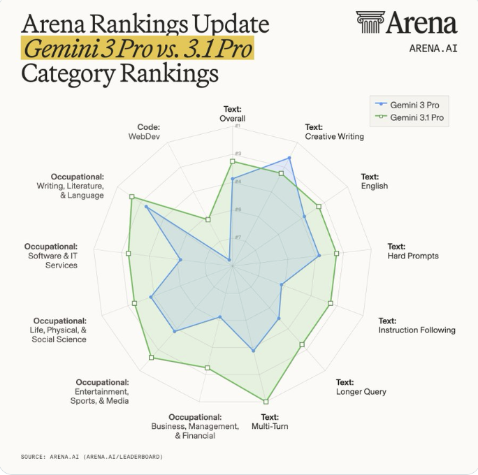 在Arena的对比评测结果中,3.1 Pro的整体排名分数也比3 Pro高出13分,文本与代码维度的表现进步也相当明显: