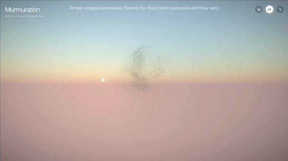 比如下面这个案例:3.1 Pro直接生成了一个3D版“椋鸟群飞”,视觉代码一次到位,还顺手做出了可交互玩法。