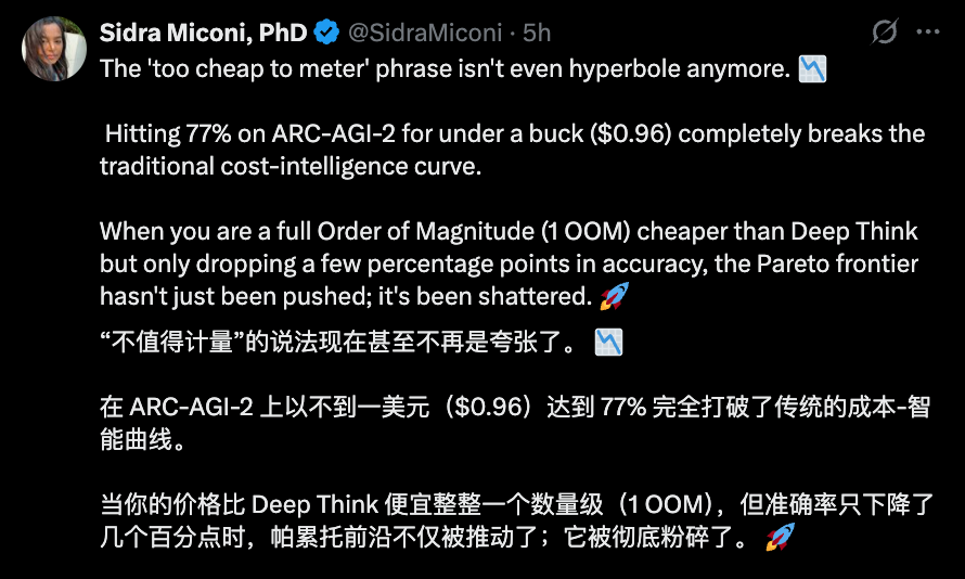 从ARC-AGI基准的视角来看,则是每完成一次ARC-AGI-2任务花费0.96美元(约合人民币6.63元)——