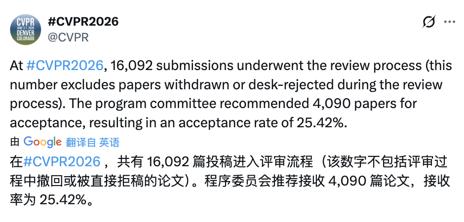 【新智元导读】CVPR 2026放榜了!本届共有16092篇投稿,最终4090篇被Accept,录用率25.42%。论文被录用的作者们,已经纷纷晒出喜讯了。