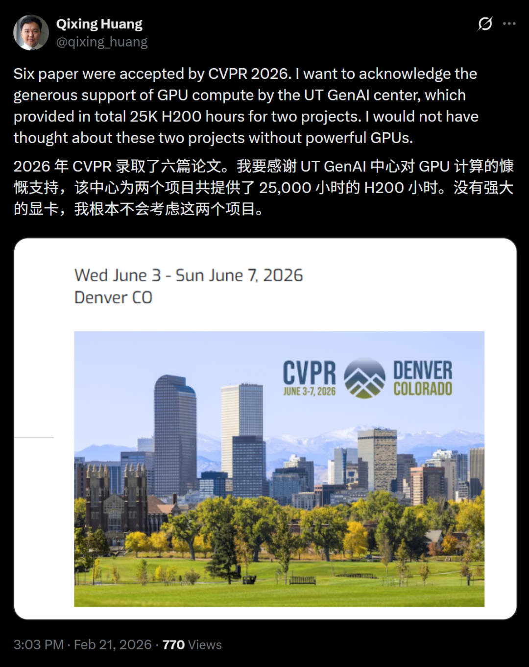 他晒出喜讯,同时感谢了UT GenAI中心在GPU计算资源方面的慷慨支持,他们为两个项目总计提供了25,000小时的H200算力。
