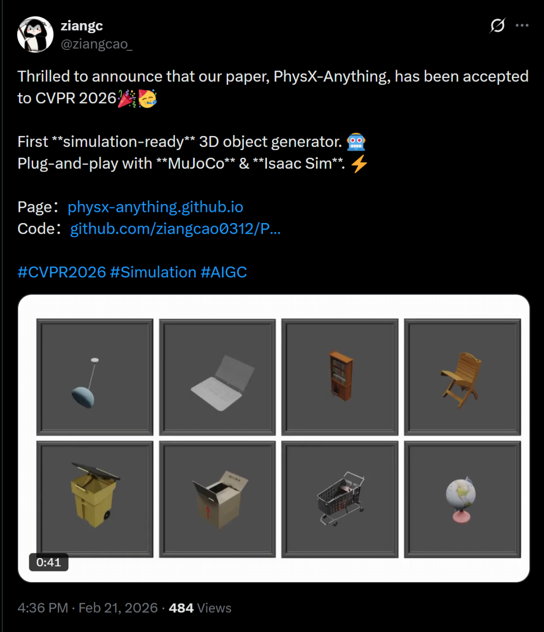 南洋理工大学博士生曹子昂分享称,自己团队的论文PhysX-Anything已被顺利接受。