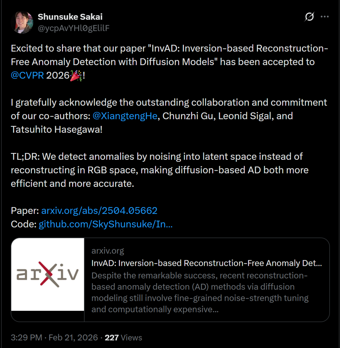 这篇论文提出了一种新的基于扩散模型的异常检测方法——InvAD,核心思想是:不再通过「重建图像再对比」来检测异常,而是直接在潜空间中加噪并做概率偏离判断。