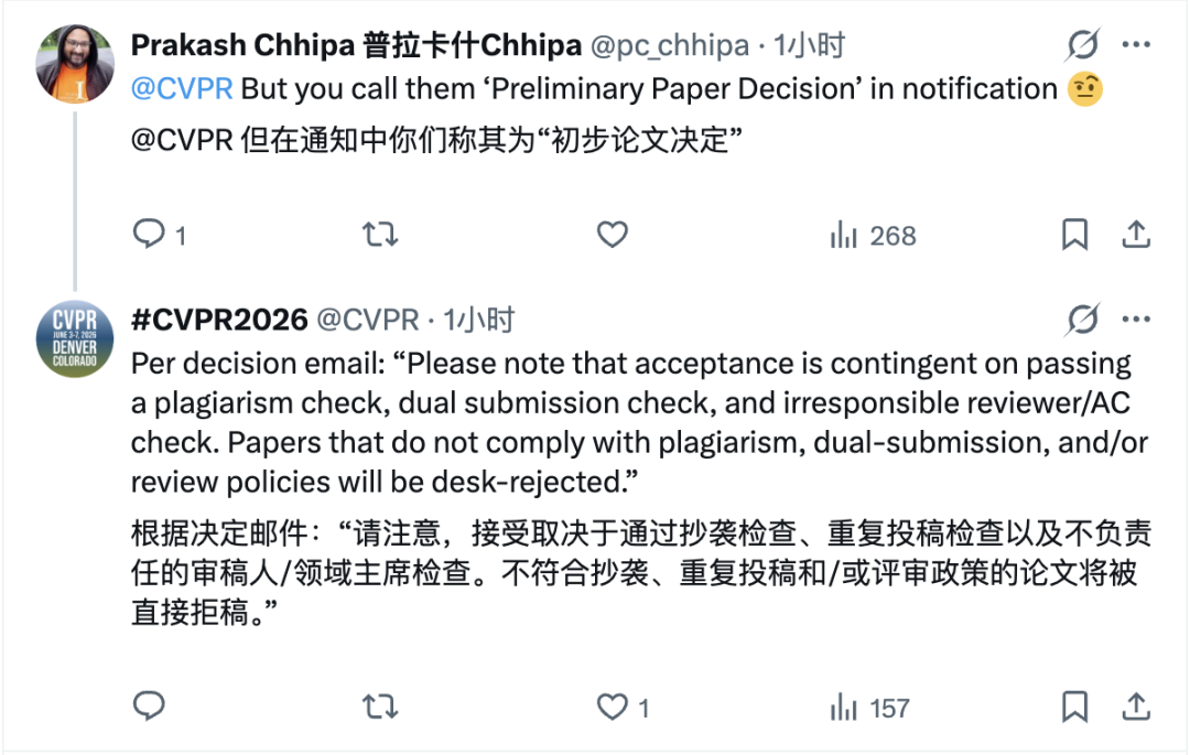 此外,官方在邮件中用「Preliminary Paper Decision」(初步论文决定)来描述这次通知,也被眼尖的研究者捕捉到并在X上提出质疑。