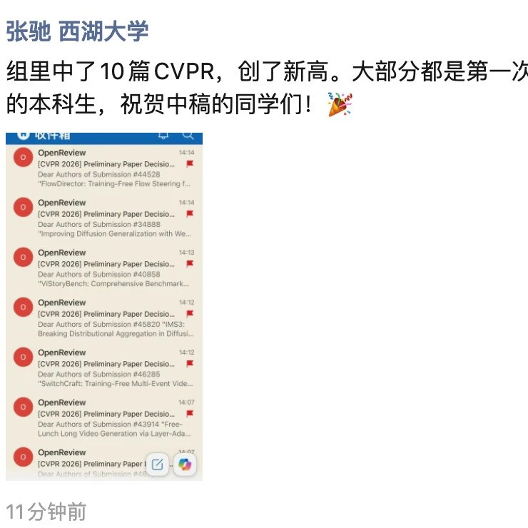 西湖大学张弛老师的组里,总共中了10篇CVPR,而且大部分都是第一次投稿参会的本科生。