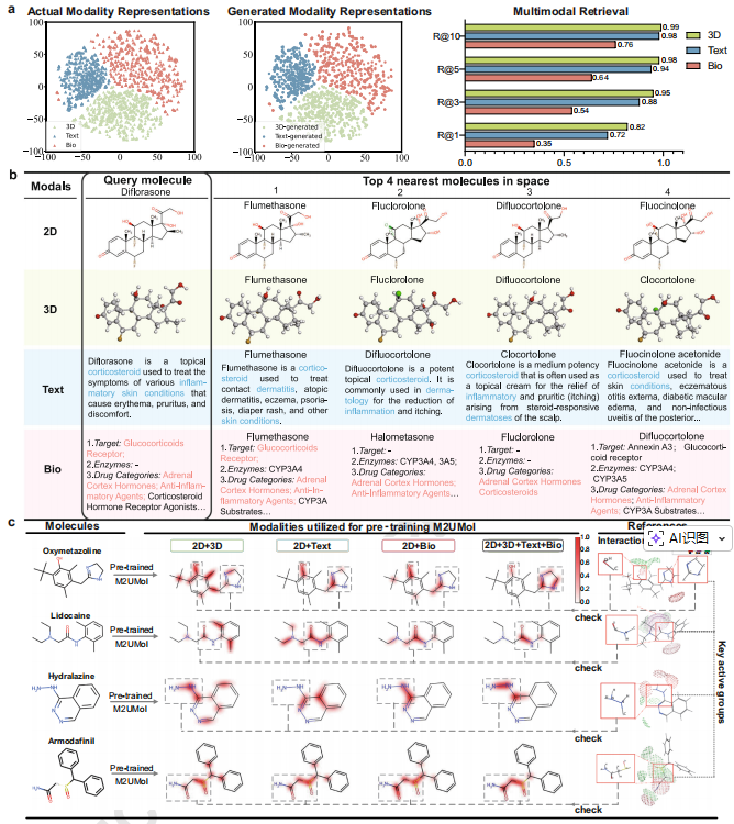 M2UMol可以从2D分子图生成可靠的多模态表示。 M2UMol能够仅从相应分子的2D表示就能生成多模态伪表示。为了评估生成多模态表示的质量,作者通过t-SNE可视化实际和生成的多模态表示。如上图a可以观察到,实际的模态表示和生成的模态表示都根据模态类型分别分布到三个聚类中。观察表明,M2UMol可以捕获不同模态的差异化知识,并将其传输到adapter中,以便它能够仅基于2D表示生成可区分的表示。此外,作者进行了多模态检索任务来评估生成的多模态表示的质量。由于所有实际和生成的表示都具有相同的维度,因此作者考虑在一个共同的欧几里得空间中的所有匹配的生成-实际表示对,检查每一对中的实际表示是否在top-k个距离最近的表示之内,作者利用广泛使用的度量Recall@K,k在{1,3,5,10}中可选,来评估多模态检索任务中生成的多模态表示的质量。如图a中的条形图所示,可以观察到:(1)所生成的3D表示比所生成的其他模态的表示质量更高,这可能是由于3D和2D之间较小的模态gap,因为3D和2D都描绘分子结构信息;(2)尽管文本和2D之间存在很大的模态gap,并且文本的数据规模小于3D和Bio,生成的文本表示仍然很好地近似于它们匹配的实际表示(Recall@1=0.72,Recall@10=0.98),表明M2UMol能够有效地弥合模态差距;(3)生成的Bio表示的质量相对较差,但可以接受(Recall@1=0.35,Recall@10=0.76),这可能是由于二进制生化特征向量的稀疏性。这证明了M2UMol在仅使用2D分子图生成可靠的多模态表示方面的鲁棒能力。此外,受先前研究的启发,作者进行了案例研究,以表明M2UMol有效地捕获语义信息,从而为共享相似特征的分子产生相似的表示。(ID:DB 00223)作为查询分子,并在2D表示空间或生成的3D/Text/Bio中检索其前4个最接近的分子,并将检索到的分子的模态数据在图b中可视化。每个模态表示空间中的前4个最接近的分子表现出类似于二氟拉松的特征。具体而言,在2D模态中,二氟拉松和最近的氟米松是一对构象异构体,它们与其他三种分子的区别仅在于少数基团,例如F被CL取代和CH3被OH取代。在3D模态中,二氟拉松及其邻近分子具有高度相似的原子组成和结构。在文本模态中,所有列出的分子都是具有抗炎作用的皮质类固醇。在Bio模态中,所示分子靶向糖皮质激素受体,也可以被CYP3家族中的酶代谢。这说明了M2UMol捕捉分子之间内在关系的能力。此外,最相似的分子在不同的模态空间中会有所不同,这突出了M2UMol能够从多模态角度进行分析,并为每种模态生成不同的表示。这种能力确保为每种分子提供互补和全面的信息。