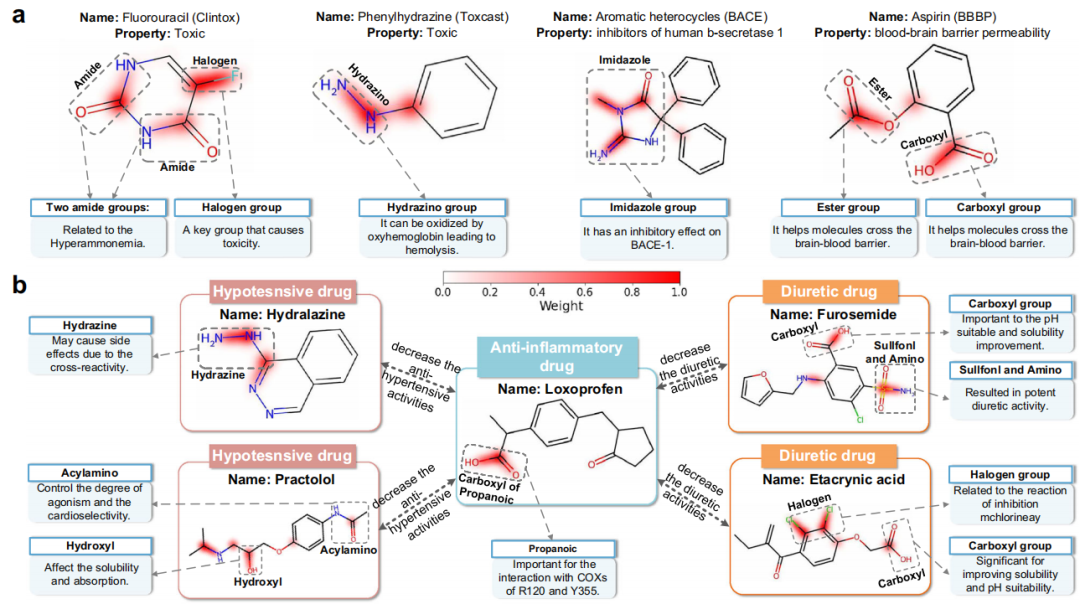 对于DDI预测,作者选择临床上常用的镇痛药和抗炎药,即洛索洛芬,一种非甾体抗炎药,如图b所示,M2UMol精确地聚焦于洛索洛芬的丙酸基团中的羧基,这是高效率的关键活性组并有助于抑制参与促进利尿作用和抗高血压作用的甘草素的合成。在这里,我们随机选择两种利尿药物(呋塞米和依他尼酸)和两种利尿药物(肼屈嗪和心得洛尔),它们分别被M2UMol预测为与洛索洛芬发生“利尿活性降低”和“降压活性降低”DDI事件,用于可视化。如图5b所示,对于呋塞米,M2UMol关注磺酰基和氨基,这是产生强效利尿活性的关键基团。此外,M2UMol还关注呋塞米的羧基,这已被证明是一个重要的活性基团,具有相当大的分子间相互作用潜力。对于依他尼酸,M2UMol侧重于卤素基团和羧基,前者可与有关利尿活性的靶点相互作用,后者对pH适宜性和溶解度改善很重要,可影响药物的吸收和效果。对于肼苯哒嗪,集中的肼基是分子中最具反应性的部分,也是最有可能自发结合蛋白质的部分。对于普萘洛尔,集中的是酰氨基,这被证明控制激动作用的程度和心脏选择性,这与抗高血压作用直接相关,而集中的羟基会影响溶解度和吸收,从而影响药物的有效性。