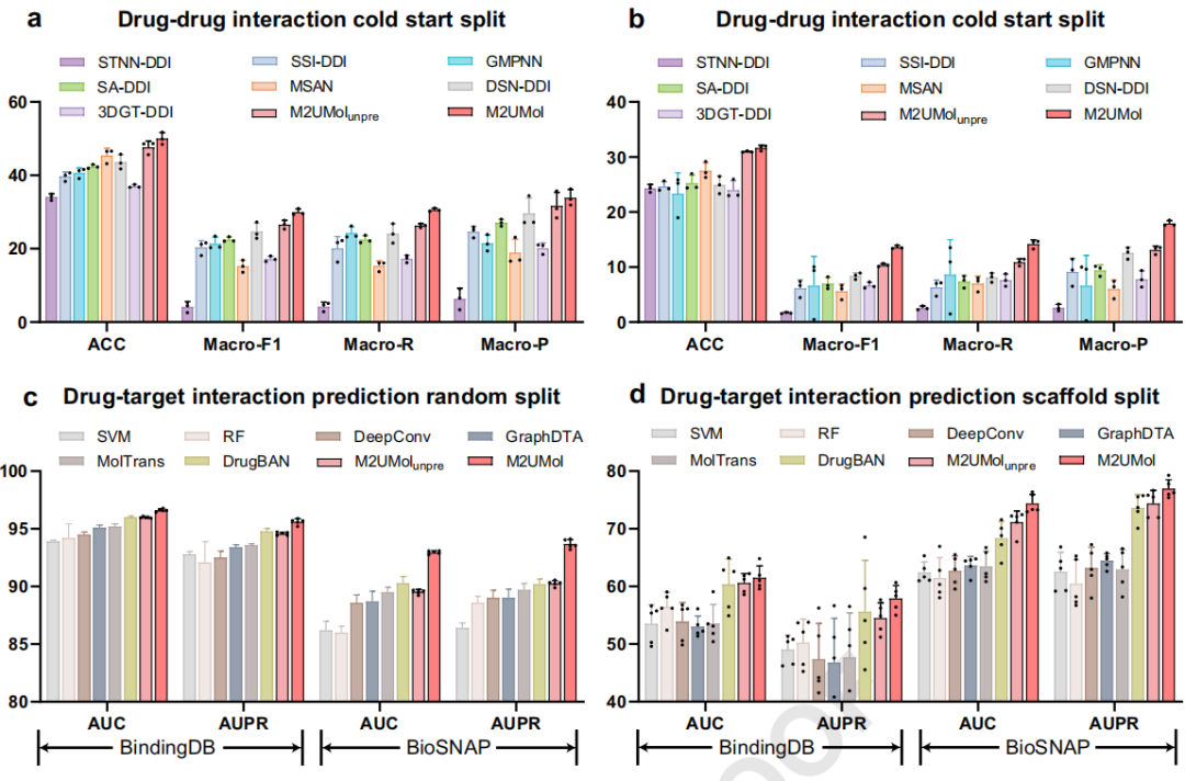 结果上图a-b所示。总体而言,M2UMol在两种情况下都明显优于所有基线。具体而言,与基线相比,M2UMol在ACC中实现了9.66%和6.84%的平均性能增益,在Macro-F1中实现了11.92%和7.74%的平均性能增益,在Macro-R中实现了12.03%和7.47%的平均性能增益,在Macro-P中实现了12.27%和10.43%的平均性能增益。DTI预测是药物发现中不可或缺的一步,有助于缩小候选化合物的搜索范围。作者将DrugBAN(预测DTI的里程碑方法)中的药物表示学习模块替换为M2UMol的微调架构,以使M2UMol适应DTI预测。然后,作者遵循DrugBAN中的两个评估场景,即随机划分和骨架划分,以展示M2UMol在改善DTI预测方面的能力。图c-d显示了不同方法在DTI预测中的结果。可以观察到,与DrugBAN相比,M2UMol_unpre的结果没有显著改善,而M2UMol的改善尤为明显。更具体地说,M2UMol的表现优于DrugBAN,在两个评估场景的两个数据集上,AUC平均改善2.60%,AUPR平均改善2.48%。总之,M2UMol在两个分子相互作用预测任务上都实现了优秀性能,展示了其可靠性、灵活性和鲁棒性,这归因于其能够提供高质量的药物分子表示。其在预测分子相互作用方面的优越性也突显了其在促进人工智能辅助药物发现方面的非凡潜力。